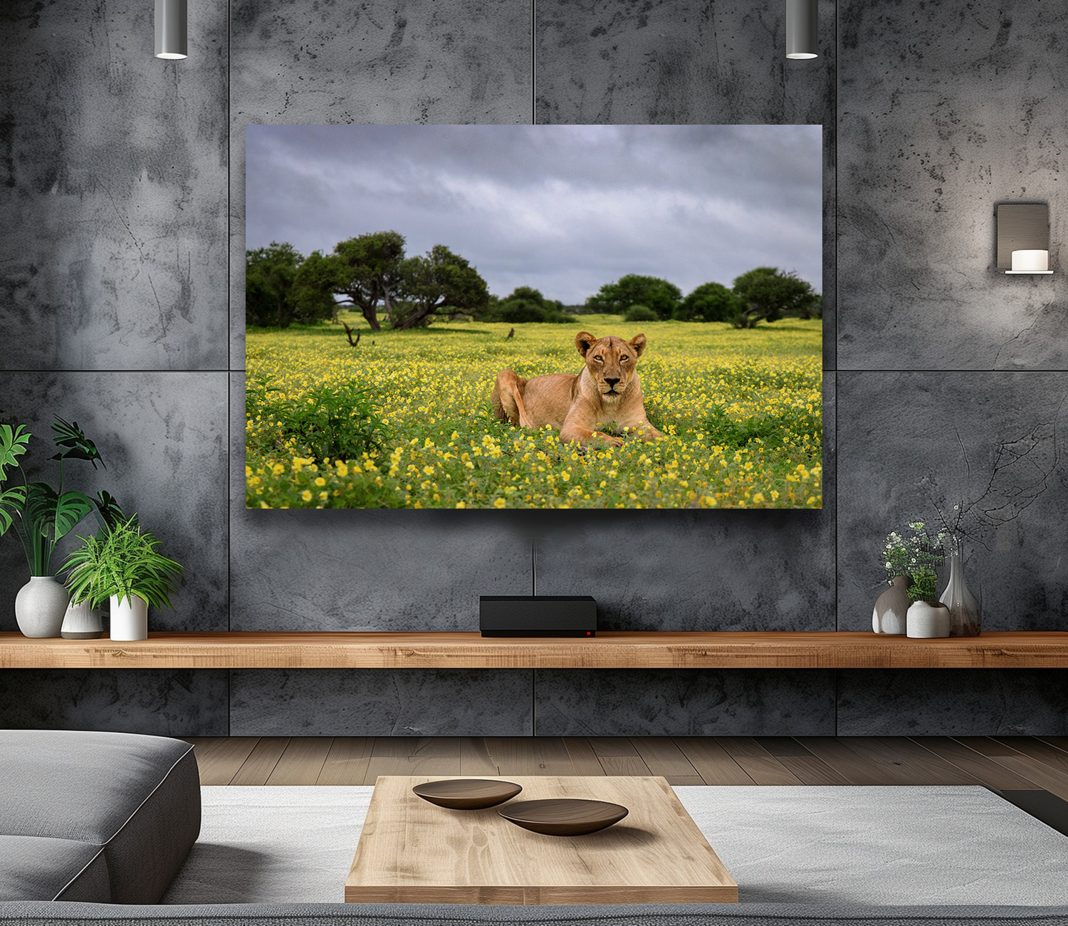 Photographed from a low angle, a lioness lies quietly among a carpet of yellow devil’s thorn flowers, her steady gaze meeting the viewer at eye level. The perspective draws you down into the scene, encouraging a slower look at both the lioness and the luminous yellow blooms surrounding her.