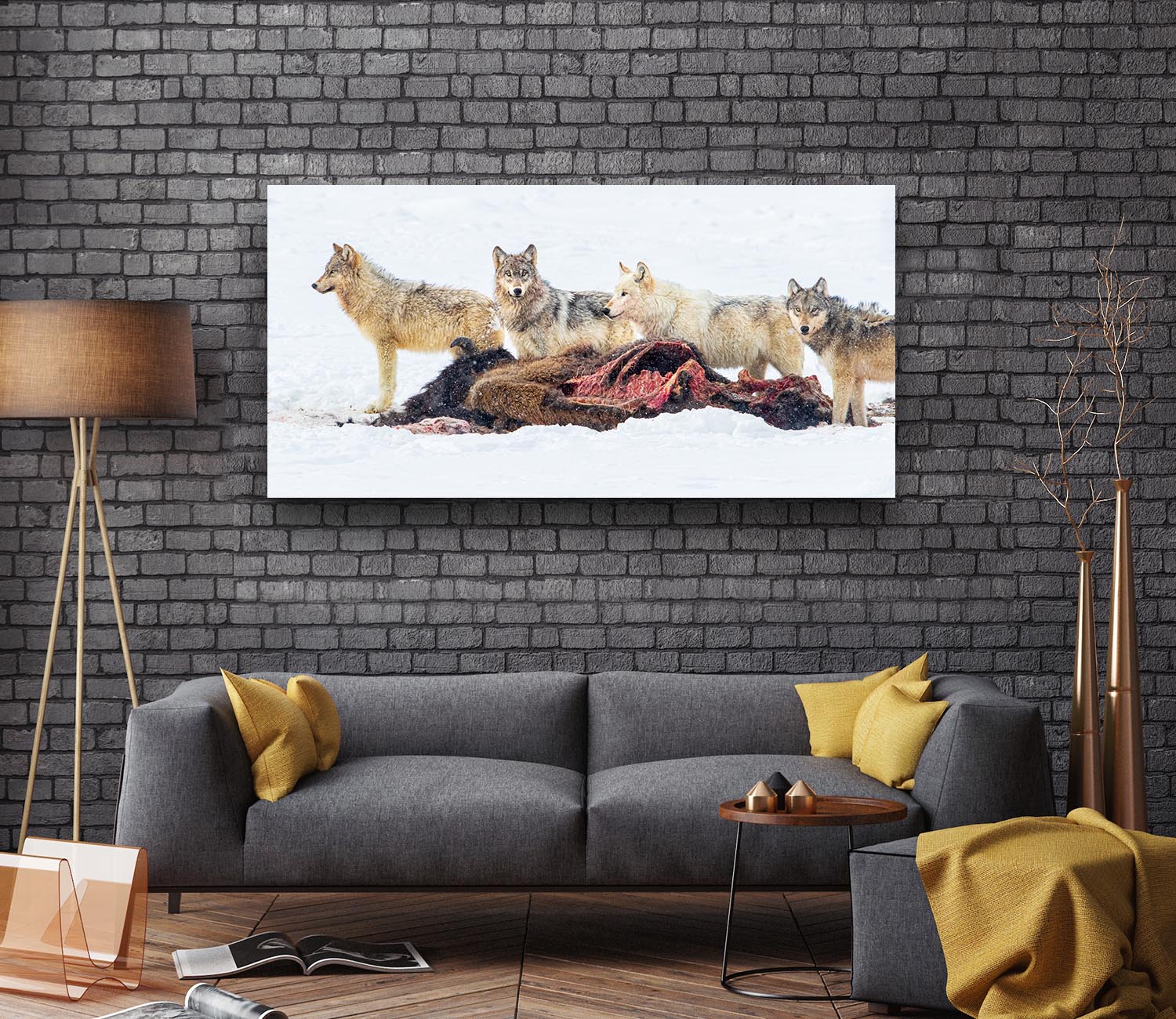 Four wolves from a hunting band of the Wapiti Pack in Yellowstone National Park’s Hayden Valley take a short break from feeding on a bison kill after a successful hunt. Yellowstone is one of the best places in the world to watch, hear and photograph wolves. These packs and animals are carefully tracked and have rich stories to rival any human epic. The white wolf in the middle is a third-generation white alpha female. Both her grandmother and mother were white alpha females of their packs. An alpha male forced out of his pack to the north eventually found his way to the female you see here, and they started the Wapiti Pack with two successful litters. That male has since been forced out by younger males, but while still alive, he was known to sneak in to visit his pups.
