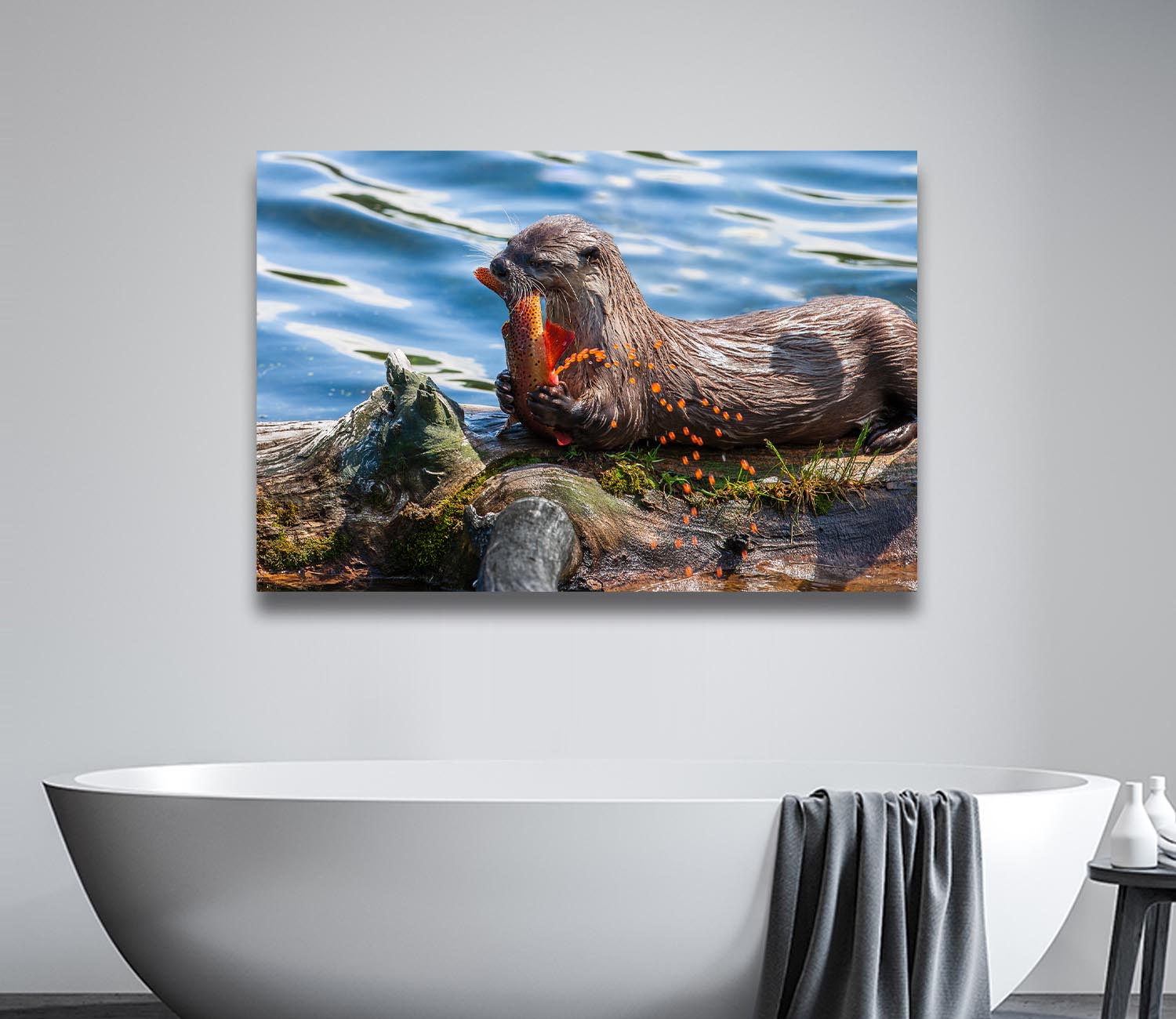 A Northern River Otter delights in a messy meal of a beautifully colored female Yellowstone Native Cutthroat Trout during the summer spawn. Otters are graceful in water and quick on land, making them adorable yet highly effective predators. During their spawn, Cutthroat Trout provide food for many animals including bears and osprey. And no part of the fish are wasted, with young otters often cleaning up any scraps and eggs left from the feast.