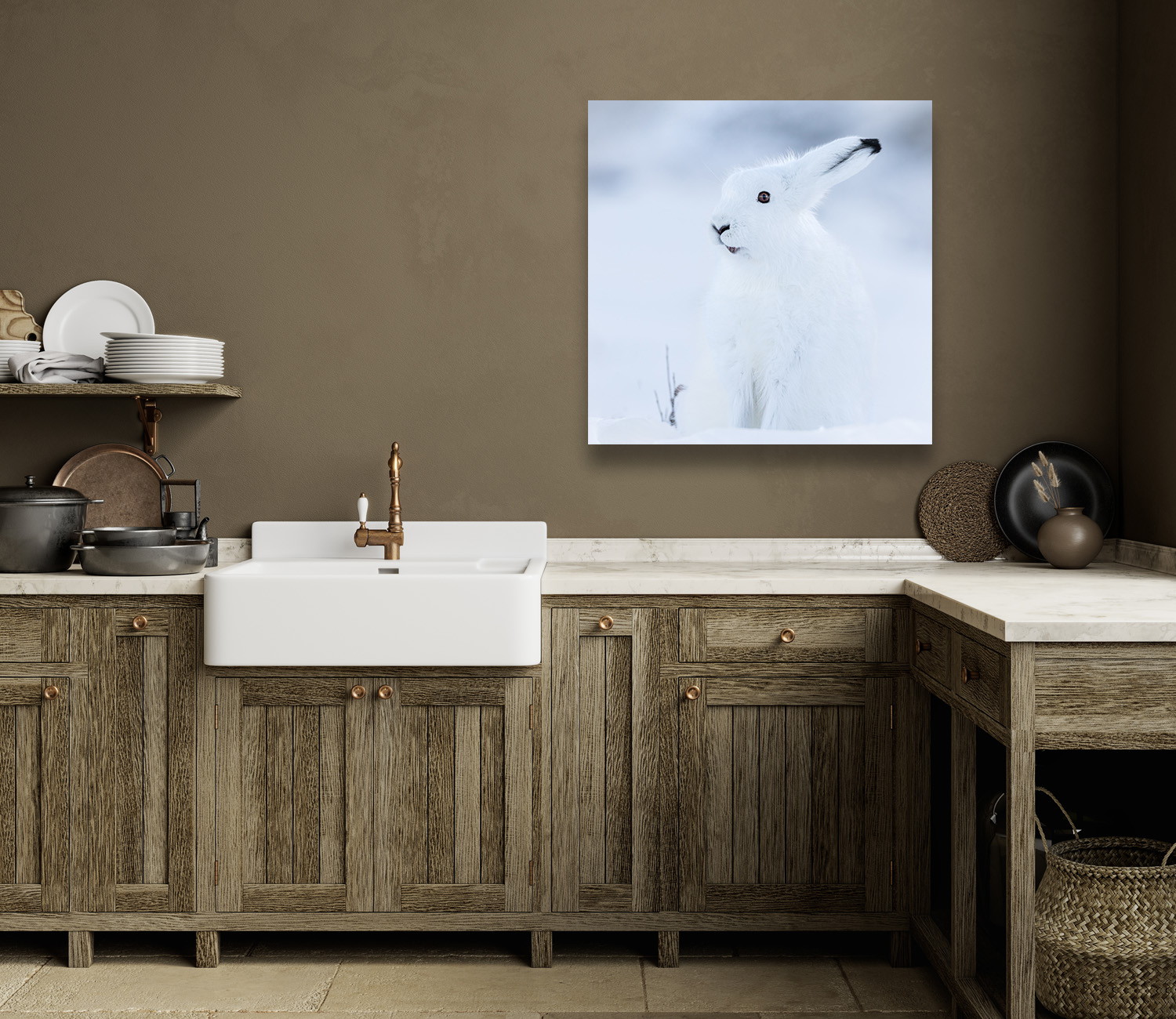 An Arctic hare in full winter coat is camouflaged within a white Arctic landscape, with only its dark eye and ear tip visible in a minimalist portrait.
